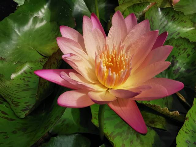 Une variété populaire aux fleurs nombreuses et parfumés. Sa fleur est de couleur pêche, rose dans les teintes pastels, ses grandes feuilles vertes maculées de tâches pourpres donne a cette plante un esthétique fort agréable. Très florifère, il est facile a cultiver.