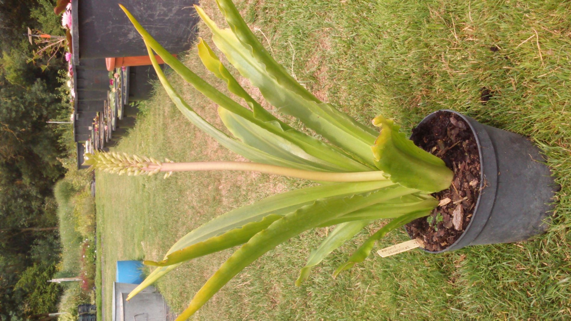 Cette fleur d'ananas a la particularité d'avoir des feuilles jaune d'or qui verdissent un peu pendant la saison. Il fleurit blanc et monte a 60 cm environ. Les feuilles sont a l'oblique ce qui lui donne un aspect surprenant et typique. Il préfère les sols drainant et frais à sec. Il est encore assez rare, sa rusticité est de -15°C si le bulbe est enterré sous 15 cm de substrat.