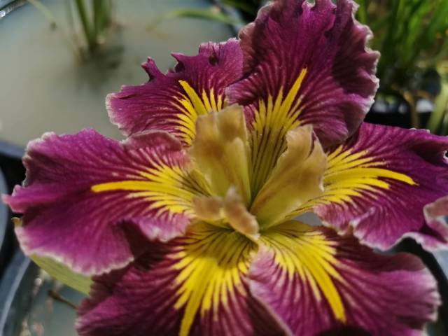 La fleur est très surprenante de part son coeur larmoillant de jaune. le reste de la fleur lie de vin contraste avec le jaune. Il est tout a fait remarquable et possède les mêmes exigences que les autres iris de Louisiane.