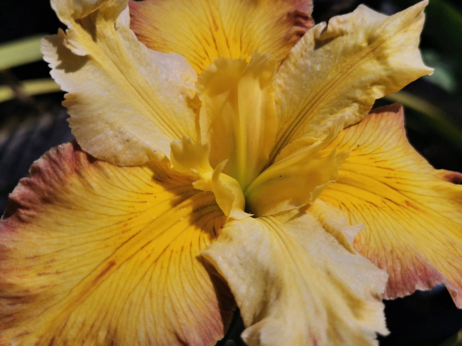 Un iris de Louisiane dont la fleur aux reflets jaunes orangés est très joliement striées. Cela donne l'impression que la fleur à été découpée dans le coeur d'un morceau de bois. Délicate et splendide a la fois.