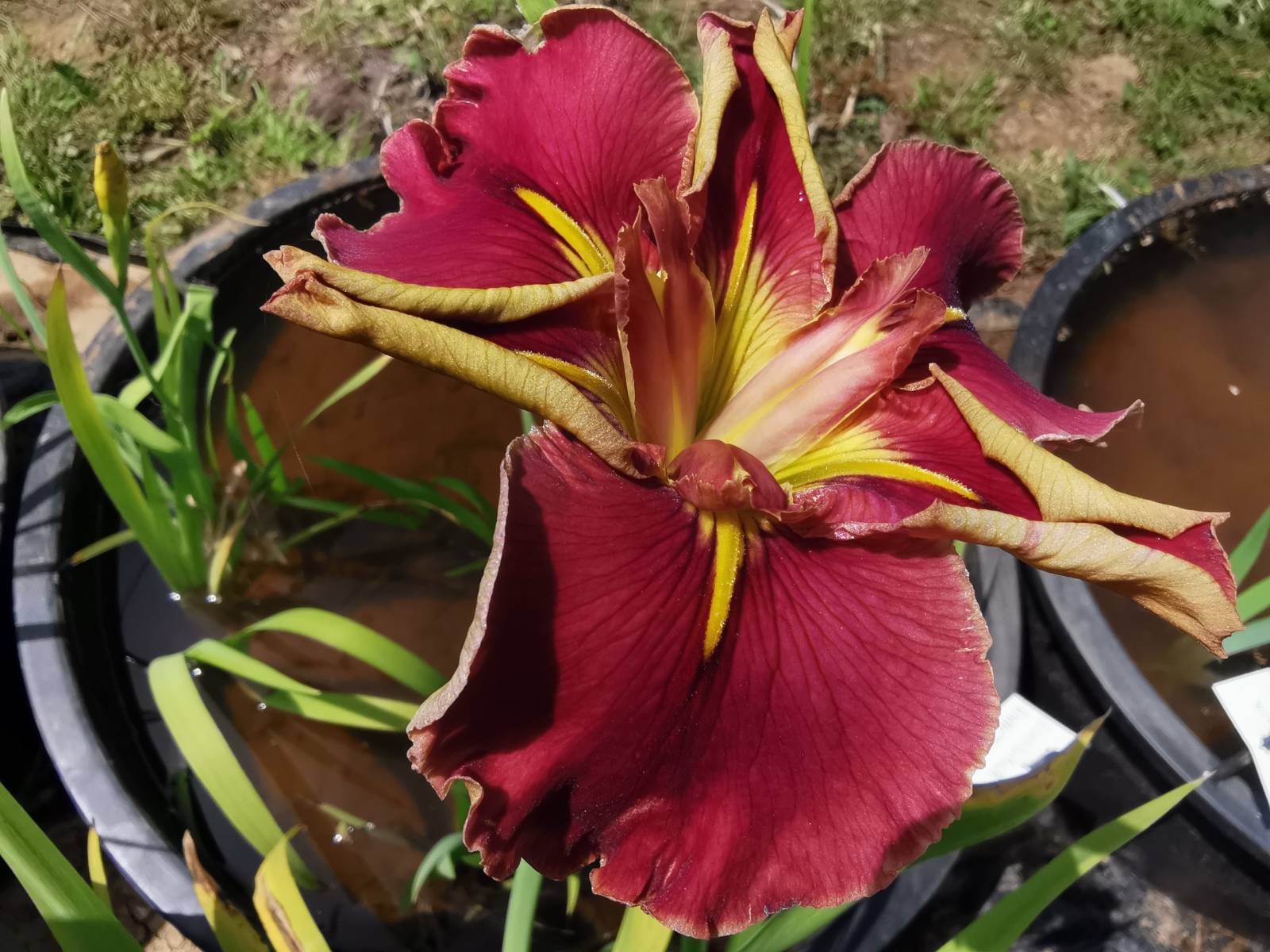Un iris rouge avec les pétales veloutés qui contrastent avec la larme jaune en son centre. Un très bel iris qui à été primé pour la profondeur de son rouge pourpré velouté assez inédit. Il est très rustique et aime avoir les pieds sous l'eau en plein soleil pour bien fleurir.