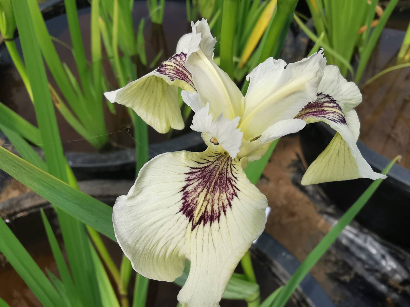 Un iris des marais blanc avec un oeil très prononcé. C'est mon préféré des iris des marais tellement l'oeil est remarquable parmi sa multitude de fleurs blanche. Il est très rare en Europe mais tout aussi facile a cultiver que son confrère jaune. Il a les mêmes exigences. Sa croissance est assez rapide et plutôt compacte.