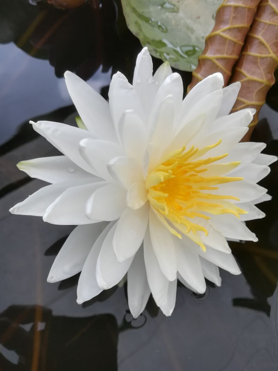 Encore une obtention très récente de Tony Moore, de 2011. Sa grande fleur est un flocon de neige, bien blanche avec des pétales très fins longs et poitus disposés en forme de demi boule a la surface de l'eau. Ses feuilles sont vertes et rondes. Il a besoin de temps et d'espace pour débuter sa floraison.