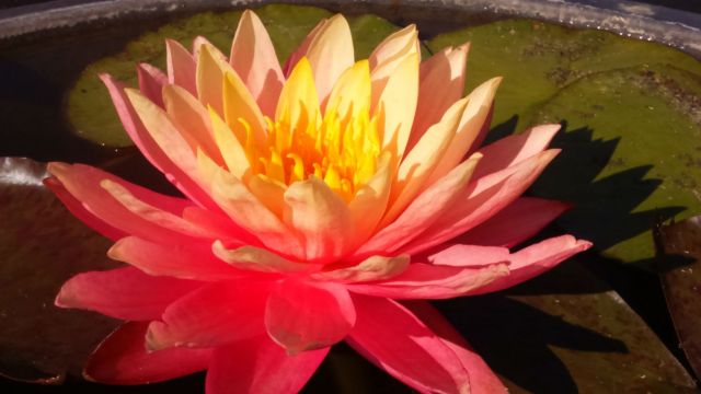 Ce nénuphar est tout simplement extraordinaire. Ses fleurs sont grandes et avec des couleurs changeantes selon plusieurs critères : la température de l'eau, l'ensoleillement, les engrais,...Elles ont une forme d'étoile assez double et parfois au coeur blanc jaune, mais aussi orange et rose saumon pêche sur les extérieurs. Bref, superbe ! Ses feuilles sont rondes, vertes avec des tâches pourpre qui partent en vieillissant. Il est très florifère, même dans peu d'eau.