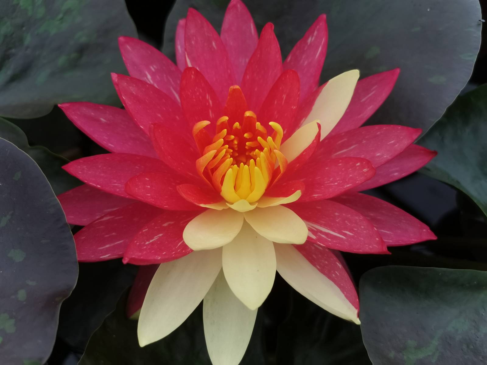 Ce nénuphar est sans doute l'un des plus surprenants de tout les temps. Il est d'origine Thaïlandaise et obtenu en 2009. Ses fleurs sont changeantes, la plupart du temps rouge orangé rose ponctuées de jaune, mais il peu produire des fleurs plus jaune orangé aux points jaunes. Aussi, il peu avoir des fleurs avec des quartiers ou des moitiés complètement jaune lumineux et l'autre de sa couleur d'origine. C'est un peu la loterie. Elles sont en forme de coupe bien au dessus de l'eau avec le cœur plus lumineux. Ses feuilles sont aussi très surprenantes, elles sont chocolat ponctuées de vert et parfois, il y a des feuilles dont la moitié est verte et l'autre de la couleur normale. Il est vigoureux, très florifère et de culture très facile.