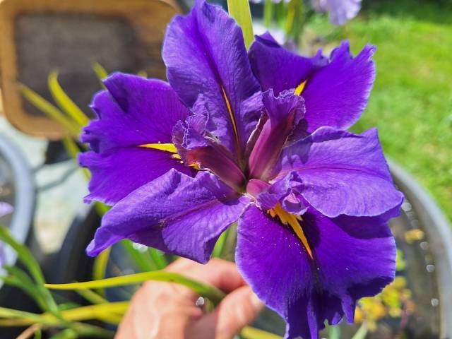 Un iris né et obtenu a la pépinière en 2023. Sa fleur est assez grande, 12 cm de diamètre, d'un violet assez foncé satiné avec un signal pointu et orangé. La hampe florale est haute et puissante. Il est complètement rustique, et très florifère. Il aime le plein soleil. C'est un grand iris puissant et vigoureux.