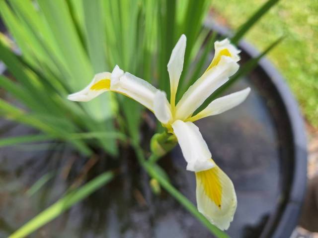Cet iris possède une floraison tout a fait singulière. De nombreuses fleurs fines, blanches au coeur jaune. Alors que les versicolor ont une base de couleur violette dans la fleur, celui ci serait issu d'un croisement naturel avec Iris virginica. Il n'est pas très grand, autour de 70 cm et reste très compact. Il aime le soleil mais tolère la mi ombre. Il est très rustique et épanoui ses fleurs en avril, mai.